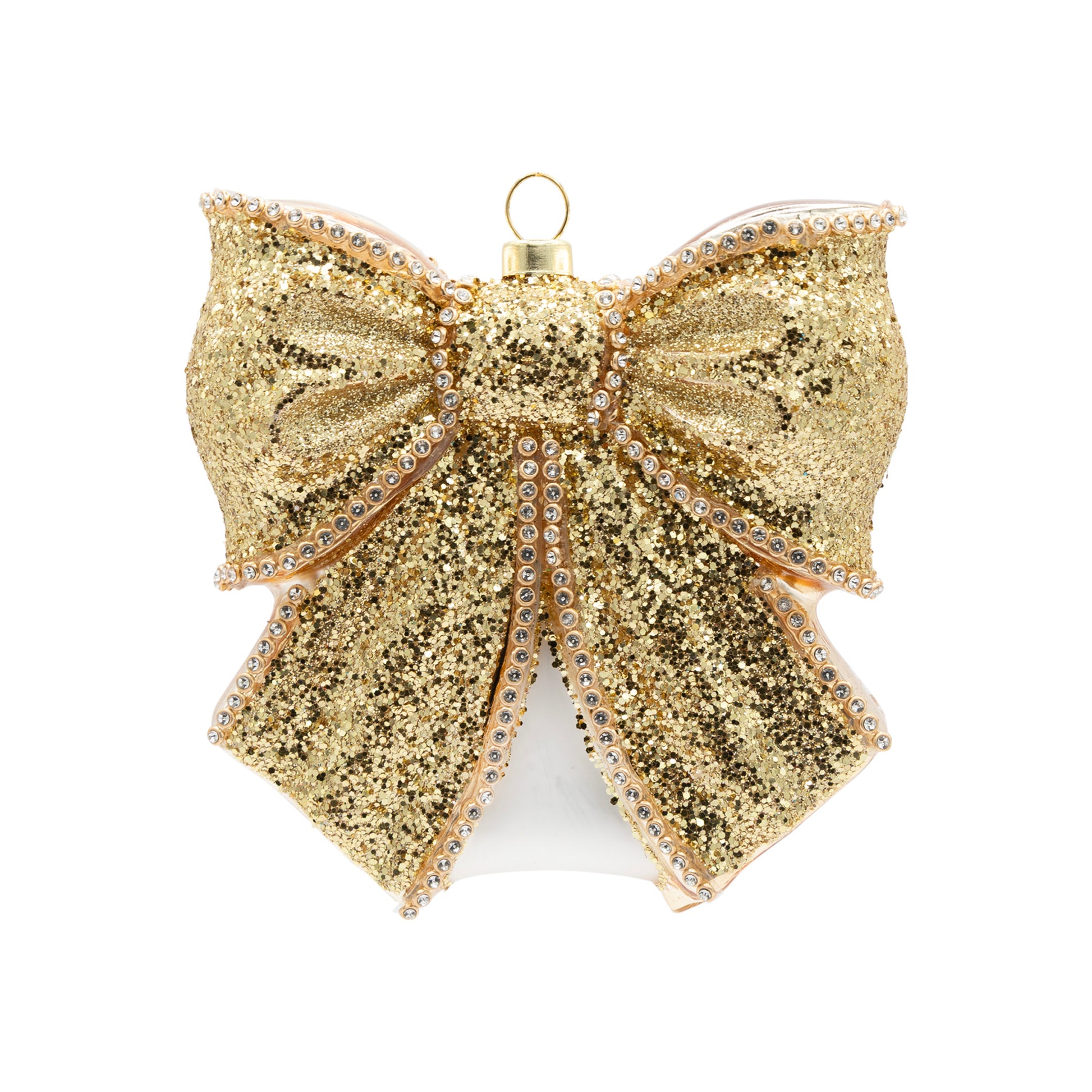 Wrapped in sparkle. This golden bow ornament features layers of glitter and jewel-like details for a luxe, festive look. Glamorous yet playful, it’s a shining accent that elevates your holiday décor.